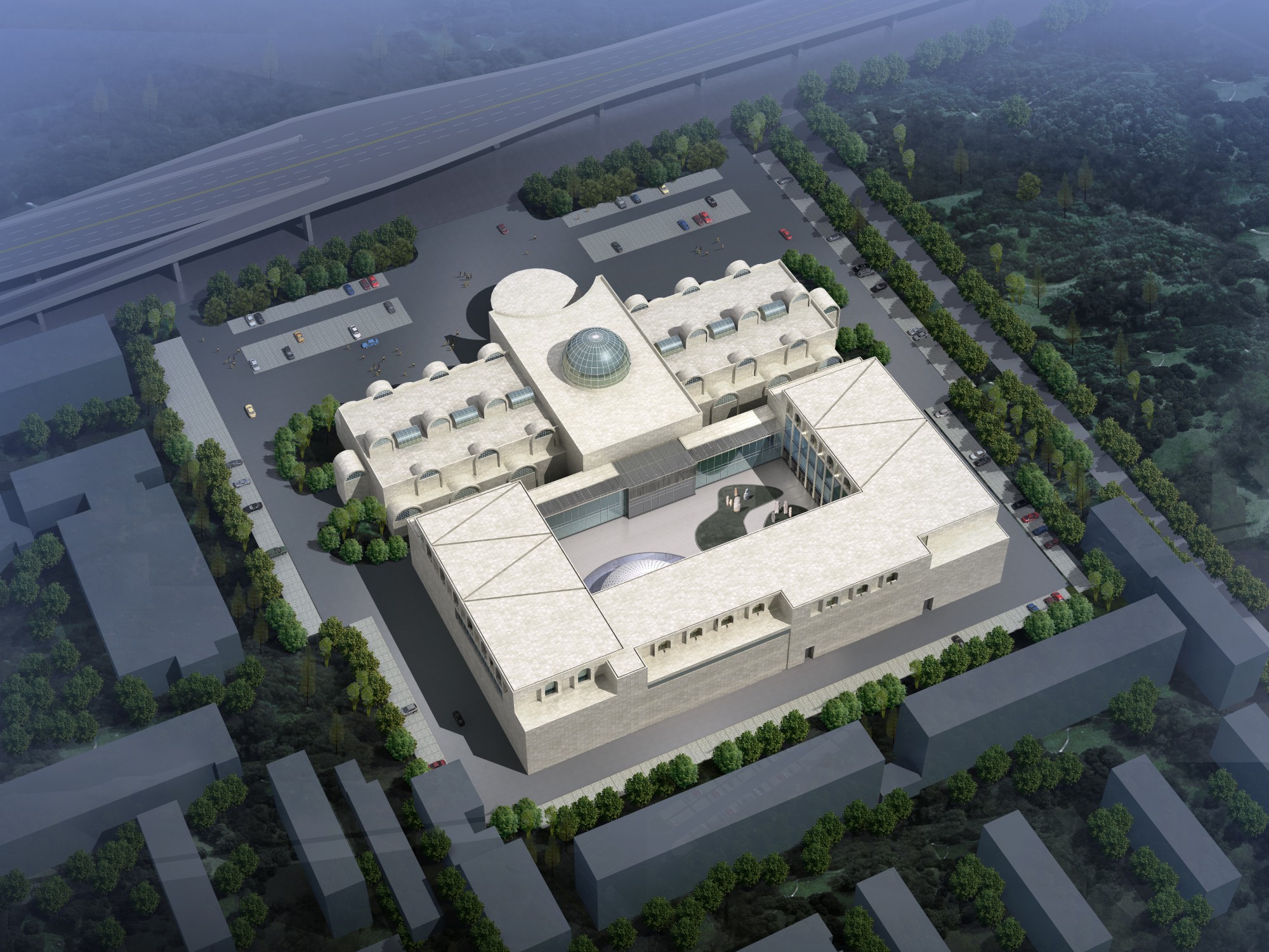 新馆建筑面积17288平方米,地下一层、地上二层,主体高18.5米,玻璃穹顶顶标高29.5米,建筑平面基本呈“一”字型平面对称布局,具有浓郁西域风格和新疆地方特色。